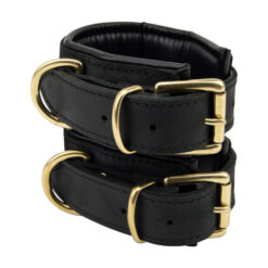 Get tied up with these exquisite black nubuck leather wrist cuffs with brass detail. These extremely high quality, durable nubuck wrist cuffs will be sure to set the scene, soft and padded for additional comfort, making them a treat to wear for long sessions.